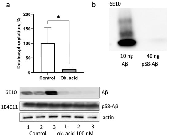 Dephosphorylation of pS8-Aβ in lysates of HEK293 cells (a). The result of three independent experiments is summarised on a graph (a), and photographs of representative nitrocellulose membranes after Western blotting, stained with 6E10 antibodies (a,b), 1E4E11 antibodies (a) or actin antibodies (a) are shown. The specificity of 6E10 antibodies to non-phosphorylated Aβ (b). A photograph of a nitrocellulose membrane after Western blotting is shown. *—p < 0.05.