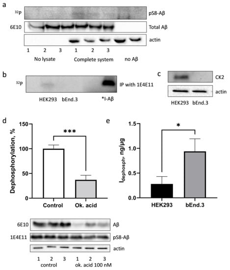 Phosphorylation of Aβ by bEnd.3 cells in the lysate (a,b). The level of CK2α protein in HEK293 and bEnd.3 (c). Dephosphorylation of pS8-Aβ by bEnd.3 cells (d) and by bEnd.3 and HEK293 cells in comparison (e). A fragment of an autoradiograph (“32P”) and photographs of nitrocellulose membranes after Western blotting stained with antibodies specific to pS8-Aβ (“1E4E11”), total Aβ (“6E10”), CK2α or actin are shown. *I-Aβ—radioactive iodine-labelled Aβ42 standard. Dephosphorylation of pS8-Aβ in lysates of bEnd.3 cells in the presence and absence of okadaic acid (d). The results of three independent experiments are summarised in histograms (d,e). *—p < 0.05, ***—p < 0.001.