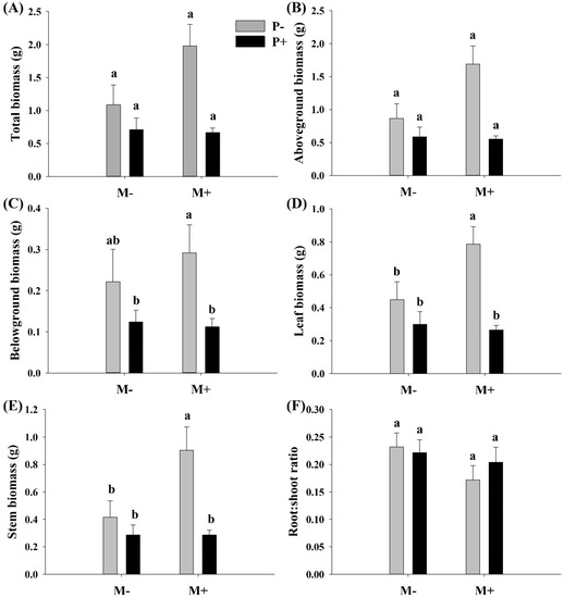 Effect of soil microbes and Cuscuta grovonii parasitism on (A) total biomass, (B) aboveground biomass, (C) belowground biomass, (D) leaf biomass, (E) stem biomass, and (F) root: shoot biomass of A. philoxeroides. Bars with the same letter do not differ significantly according to the least significant difference (LSD) post hoc test at the 5% level. Values are expressed as the mean ± standard error (n = 5). M+: soil microbe present, M−: soil microbe absent, P+: host A. philoxeroides parasitized by C. grovonii, and P+: host A. philoxeroides not parasitized by C. grovonii.