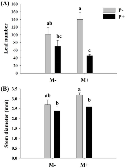 Effects of soil microbes and Cuscuta grovonii parasitism on the (A) leaf number and (B) stem diameter of A. philoxeroides. Bars with the same letter do not differ significantly according to the least significant difference (LSD) post hoc test at the 5% level. Values are expressed as the mean ± standard error (n = 5). M+: soil microbes present, M−: soil microbes absent, P+: host A. philoxeroides parasitized by C. grovonii, and P+: host A. philoxeroides not parasitized by C. grovonii.
