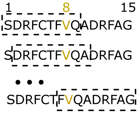Figure 1. Sliding window to extract shorter strings. In this figure, we illustrate how our sliding window of length 9 applied to 15 amino acid length peptides gives us the seven sub-peptides. In yellow, the position of the mutated amino acid, which is always preserved inside the sub-peptides. - Gravy index. Because this index is positive for hydrophobic strings, but we are interested in more exposed peptides (i.e., more hydrophilic, which correspond to negative values), after obtaining the score for each string, we normalized the score between 0 and 1 and inverted the order by calculating 1 minus the normalized score (resulting in the variable ). Next, as before, we performed the subtraction between the mutated and non-mutated score, obtaining .