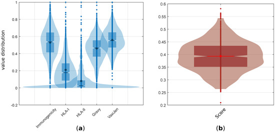 The distribution of the values varied depending on the variable. We observed that immunogenicity, the Gravy index, and the VaxiJen score were normally distributed (p-values: 0.722, 0.605 and , respectively, as determined via the Kolmogorov–Smirnov test), whereas the HLA binding variables were not (p-values: 10 and for HLA-I and HLA-II, respectively). In Figure 2, we represent the distribution and main descriptive variables in a violin plot [40] for (a) the main five characteristics of the neoantigens, and (b), the final score.