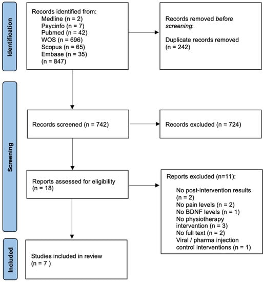 A systematic search for studies was conducted through the following databases: Pubmed, PsycINFO, Medline (Ebsco), Scopus, WOS and Embase, on 21 July 2021. An updated search was conducted in March 2022. The search strategy was based on the combination of medical terms (Mesh) and keywords relating to the following concepts: “pain”, “chronic pain”, “brain derived neurotrophic factor”, “BDNF”, “physiotherapy” and “physical therapy”. The complete search strategy is available in Supplementary Materials.