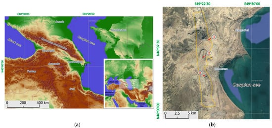 (a) Location of Gobustan National Historical and Artistic Preserve; (b) Gobustan samplings areas: 1—Kanizadag mountain, 2—Beyuk-Dash Mountain, 3—Kichik-Dash Mountain.