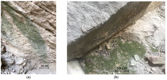 (a) Biofilms on the grotto walls; (b) Bryophytes on the grotto walls.