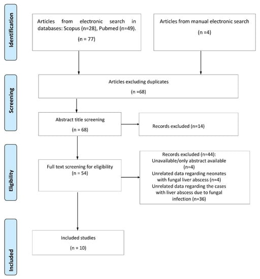 An electronic search of the existing literature in PubMed and Scopus databases until 3 November 2022 was conducted using combinations of the following keywords: “fungal”, “candida”, “liver abscess”, “hepatic abscess”, “newborn*”, “neonate*”, and “preterm neonate*”, with Boolean logic operators. Duplicate records were removed by a single researcher (R.S.) using the default settings of EndNote X8 software. Initially, two independent researchers (R.S. and P.K.T.) individually screened the titles and abstracts, and clearly irrelevant articles were excluded. A thorough full-text evaluation was followed by the researchers, resulting in the inclusion of only those studies that met the established inclusion criteria. Disagreements between the two researchers regarding the inclusion of studies were resolved with the contribution of a third author (A.G.T.). Additionally, in order to minimize the possibility of missing any relevant studies, a manual search of the electronic records was performed, while the citations of each retrieved study and of previous systematic reviews pertaining to our topic of interest were also screened.