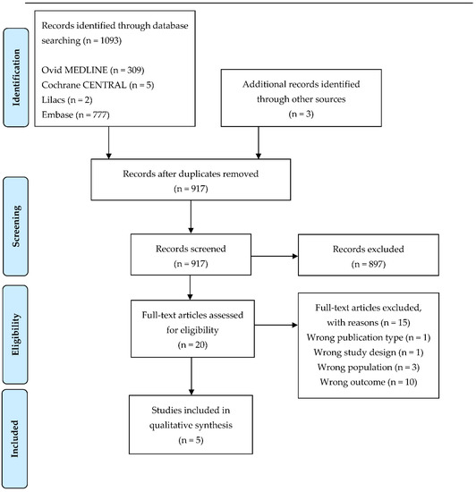 The search was run on 15 September 2021 and retrieved 1093 unique records. After removing duplicates, 917 records were screened based on their title and abstract. Most articles were excluded because they did not meet the inclusion criteria (Figure 1), so 20 full-text articles were further evaluated, and finally, five studies met our inclusion criteria and were included in this systematic review.
