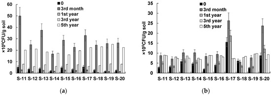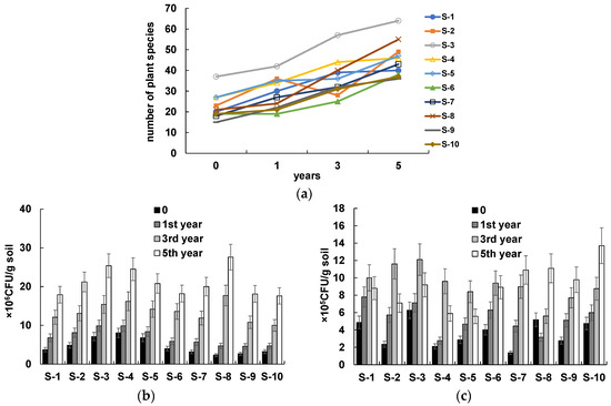 The increases in plant species diversity and the vegetation cover in plots S-1–S-10 were accompanied by increases in the numbers of soil microorganisms (Figure 1b,c). At all sites, the THM number increased steadily for 5 years (Figure 1b). The HOM number peaked in the third year, after which it decreased at the sites at which the TPH content decreased to less than 1.0 g/kg (sites S-1–S-6; Figure 1c). By contrast, the HOM number at sites S-7–S-10 continued to increase.