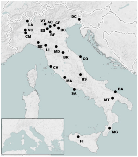 To assess the genetic diversity of the Turkey oak (Quercus cerris L.) in Italy, we sampled across most of the species’ Italian distribution range, discovering, in the process, at least one natural population in an area where the presence of Q. cerris was not previously described. In particular, we sampled 22 populations along the Italian peninsula and one in Sicily (Sardinia was excluded from the sampling plan since this species is not naturally present) throughout the species’ Italian distribution. Interestingly, a number of our sampled areas had unexpected Q. cerris distribution and represent a new finding in the Italian natural history of the species. These lie outside what is considered its ‘native distribution’ [15,16] and were collected in Bari (Apulia), Vercelli (Piedmont) and Ficuzza (Sicily) (Figure 1 and Figure S1). A total of 809 trees were sampled, with an average of 35 trees per population. Populations were selected based on historical data about forest management in order to exclude populations of uncertain origin or the ones that underwent artificial reforestation. Only healthy adult trees with clear morphological traits were included in this study, also taking into account the presence of mixed stands with other oak species and the possible occurrence of hybrids. Morphological traits used for species identification were mostly based on leaf shape (leaves are lobed with a variable number of triangular lobes), leaf surface aspects (glossy upper surface), bark aspects (vertically deeply furrowed and dark grey) and acorn aspects (hairy acorn cup) [17]. The geographical position and coordinates of the populations studied are reported in Figure 1 and Table 1, respectively.