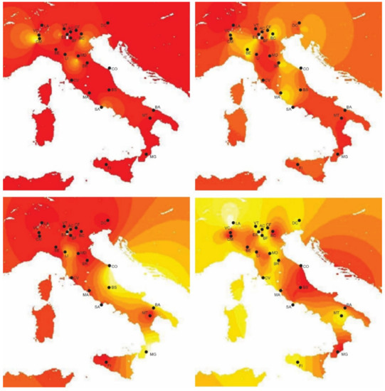 The estimate of K was based on the DIC criterion (see Section 2 and Table S2): the most probable result for the potential number of clusters that could have originated the studied populations is four. The proportions of admixture for each of the putative clusters of origin were spatially interpolated on the geographic map of Italy (Figure 2).