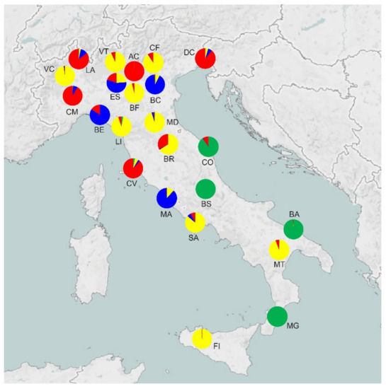 Some aspects can be inferred by looking at the prevalence of each of the four ancestral genetic pools shown in Figure 3. Northern Italy appears to be the most admixed region, with the presence of three out of four genetic pools. The central and southern parts of Italy are more homogeneous, with the important presence of the fourth gene pool (green in Figure 3) apparently not admixed if not partially for the CO standing. Overall, the most important contribution is provided by the “yellow” gene pool, observed from north to south and with a peculiar presence in Sicily. The bar chart of Figure S2 in the Supplementary Materials displays the same information at the individual tree level for each population.