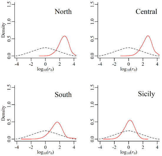 Density distributions of posterior estimates of the r0 ratio of present (θ0) and past (θ1) diversity population index (r0 = θ0/θ1) based upon the ABC “free variation” approach for the four homogenous clusters of Quercus cerris. Dashed lines: prior distribution; full lines: posterior distribution.