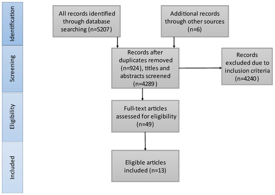 PRISMA flowchart of the search strategy and study selection. On the basis of our search strategy and also articles from other sources, we found 4289 records. After excluding irrelevant articles and full-text screening, 13 articles were identified for inclusion in our systematic review.