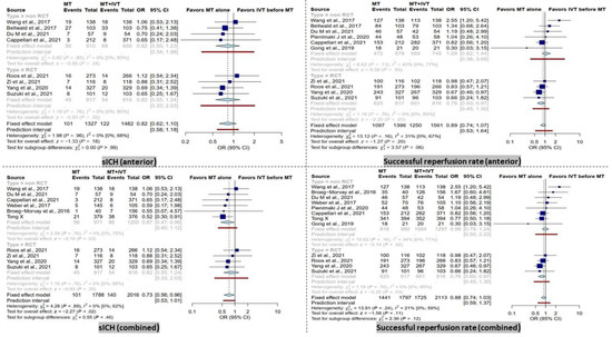 In the anterior group, comparable results were observed in terms of successful recanalization rate when comparing dMT patients with the BT group. Only in the RCT subgroup, a significantly higher successful recanalization rate in BT patients was noted (OR = 0.73 [95% CI, 0.56–0.96], I2 = 0%, p = 0.02).