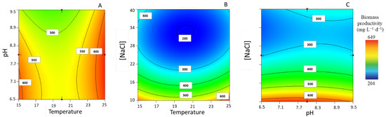 Response surface plots for highest biomass productivity (mg·L−1·d−1), with corresponding interaction effects of the parameters of temperature, pH, and [NaCl], after setting the (A) [NaCl] to 10 g·L−1, (B) pH to 7.5, and (C) T to 25 °C.