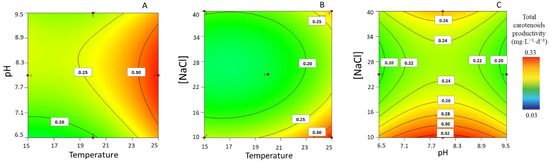 Response surface plots for highest total carotenoid productivity (mg·L−1·d−1), with corresponding interaction effects of the parameters of temperature, pH, and [NaCl], after setting the (A) [NaCl] to 10 g·L−1, (B) pH to 8, and (C) T to 25 °C.