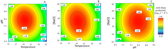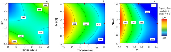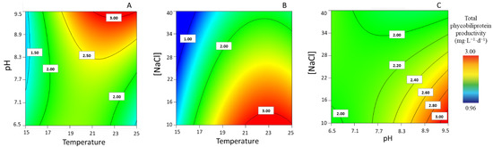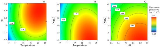 According to our experimental values, maximum PC productivities varied between 0.42 ± 0.00 and 1.99 ± 0.02 mg·L−1·d−1. The relationship between the pH and temperature (at low [NaCl] of 10 g·L−1) was observed to have a significant impact on PC productivity (Figure 4A). In addition, the relationship between temperature and [NaCl] is relevant at a pH ≈ 9, thus impacting positively upon the maximum production of PC (Figure 4B). Lower productivities are predicted when the [NaCl] increases simultaneously with low pH levels in addition to low temperatures (Figure 4C).