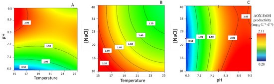 Regarding the antioxidant compound maximum productivity in ethanolic extracts, experimental data varied between 0.28 ± 0.00 and 2.10 ± 0.01 mgTE·L−1·d−1. The surface response encompassing the different parameters, in terms of AOX-EtOH productivities, is shown in Figure 7. After setting a lower [NaCl] (i.e., 16 g·L−1), the combination of a lower temperature and higher pH leads to higher productivities (Figure 7A). The plot in Figure 7B shows that, for a pH set at higher values (i.e., 9.5), the combination of a low temperature and a low [NaCl] favors AOX productivities. Furthermore, the plot in Figure 7C would appear to support the notion that a low temperature (15 °C) yields a higher AOX productivity, irrespective of [NaCl], as long as the pH is high (i.e., 9.45).