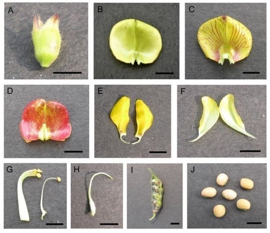 (A) Calyx, (B–D) vexillum, (E) wings, (F) keels, (G) androecium, (H) gynoecium, (I) fruit, and (J) seeds. Scale bar = 5 mm.