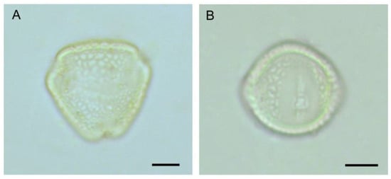 Pollen grain of Cajanus cajan: (A) polar view, (B) equatorial view. Scale bars = 10 µm.