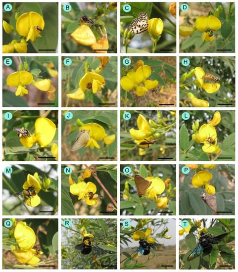 Floral visitors of Cajanus cajan: (A) Aulacophora cinta, (B) Brachymeria sp., (C) Castalinus rosimon, (D) Ceratina binghami, (E) Chinavia hilaris, (F) Coccinella sexmaculata, (G) Episyrphus balteatus, (H) Eristalinus megacephalus, (I) Halictus acrocephalus, (J) Lampides boeticus, (K) Leptocorisa acuta, (L) Megachile conjuncta, (M) Megachile disjuncta, (N) Megachile lanata, (O) Pelopidus mathias, (P) Suastus gremius, (Q) Tetragonula iridipennis, (R) Xylocopa aestuans, (S) Xylocopa fenestrata, (T) Xylocopa latipes. Scale bar = 5 mm.