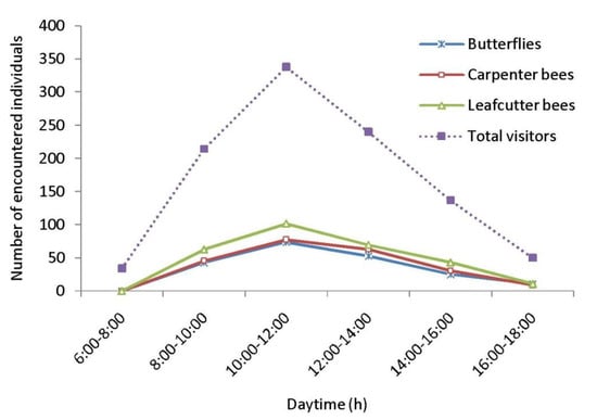 As floral visitors of Cajanus cajan, 33 insect species were identified (Table 4, Figure 4). Within the visitor’s spectrum, the order Hymenoptera is represented by 19 species, followed by Lepidoptera (6 species), Coleoptera (3 species), Diptera (3 species), and Hemiptera (2 species). The most encountered insect groups are leafcutter bees, carpenter bees and butterflies. The most abundant flower-visiting species are Megachile disjuncta (RA = 15.20%), Megachile lanata (RA = 11.55%), Xylocopa fenestrata (RA = 10.27%), Xylocopa aestuans (RA = 9.38%), Suastus gremius (RA = 7.01%), and Pelopidus mathias (RA = 5.73%). According to hours of the day, the numbers of encountered floral visitors were higher during 10.00–12.00 h (Figure 5) and lower in the early morning (6.00–8.00 h) and late afternoon (16.00–18.00 h).