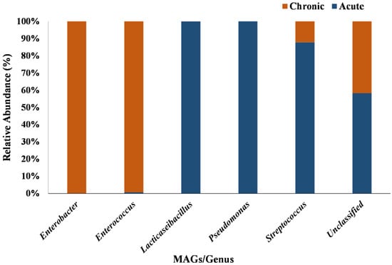 The distributions of relative abundance (%) represented as stacked bar plot for all MAGs accros the acute and chronic apical periodointitis. Enterobacter spp. and Enterococcus spp. are dominant in chronic conditions while Lacticaseibacillus spp., Pseudomonas spp. and Streptococcus spp. are dominant in acute conditions.
