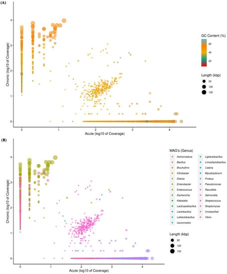 The scatter plot depicting the distributions of the contigs (≥1500 bp) and showing relationship between acute and chronic conditions. Each circle represents a contig and is colored by its GC content (A) and assigned taxonomy at the genus level (B). The length of contigs scaled the size of the circle in kbp.