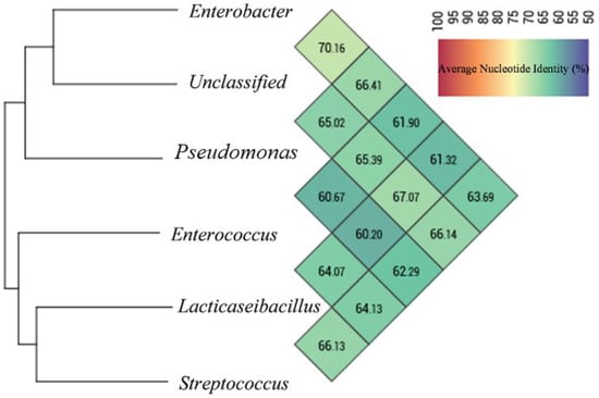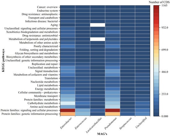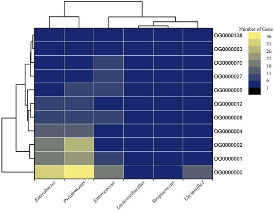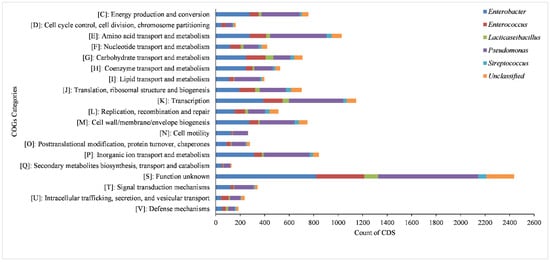 The predicted coding sequences of the six MAGs yielded 11,832 distinct clusters of orthologous groups (COGs). The highest number of the COG category (4324) was found in Pseudomonas, followed by Enterobacter with 3944 and the lowest number of the COG category (420) was found in Streptococcus (Figure 5). A total of 19 COG categories are present in all the MAGs, out of which the highest category, found in the most abundant number—2439, has a function that is yet to be known. It is followed by amino acid transport and metabolism, inorganic ion transport and metabolism, energy production and conversion, cell wall/membrane/envelope biogenesis, carbohydrate transport and metabolism and translation, and ribosomal structure and biogenesis. Most of the above annotated pathways are prevalent in Enterobacter and Pseudomonas followed by Enterococcus and unclassified bacteria, but least prevalent in Lacticaseibacillus and Streptococcus (Figure 5).