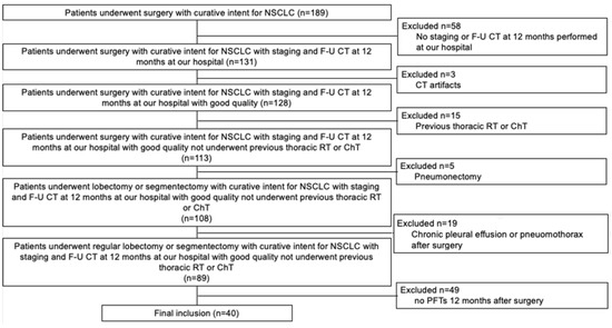 This retrospective study was approved by the Local Ethics Committee (institutional review board -IRB- approval number 897/2022/OSS*/AUSLPC). Informed consent was obtained from all subjects involved in the study; as stated by the IRB, informed consent was waived when the patient was not reachable in useful time due to organizational reasons. The study included all patients who underwent surgery with curative intent for NSCLC in our hospital between 1st January 2017 and 30th November 2021. The initial sample comprised 189 patients, with a median age of 70 years-old (interquartile range, IQR: 63–76 years-old), 124/189 (66%) males. Exclusion criteria were 1. staging or follow-up CT 12 months after surgery (F-U CT) not performed in our hospital; 2. CT artifacts; 3. thoracic radiotherapy (RT) or chemotherapy (ChT) performed before surgery; 4. surgical pneumonectomy; 5. chronic pleural effusion or pneumothorax at surgery side; and 6. no availability of PFTs 12 months after surgery. The staging process was performed on the basis of the current guidelines of the European Society of Medical Oncology (ESMO) and of the eighth edition of the TNM classification for lung cancer [1,12].