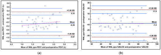 In Table 2 are summarized the findings of the correlation and agreement analysis. Postoperative FEV1 and %DLCO were significantly (p < 0.001) correlated with WAL ppo values (for FEV1 rho = 0.842; for %DLCO rho = 0.717). The agreement between WAL ppo-FEV1 and post-operative FEV1 was excellent, with an ICC of 0.904 (95% CI 0.819–0.949) and LoA included between +0.35 L and −0.87 L at Bland–Altman plot (Figure 2a and Figure 3). The agreement was good between post-operative %DLCO and WAL ppo-%DLCO, with an ICC of 0.770 (95% CI 0.566–0.878) and LoA ranging from +17% to −32% according to the Bland–Altman plot (Figure 2b and Figure 3).
