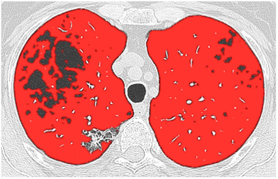 All images were anonymized and transferred to a dedicated workstation. A radiologist (D.C.) with seven years of experience quantified WAL by using the commercial software (IntelliSpace Portal; Philips Health System, Best, Netherlands) available in our Hospital. The Chronic Obstructive Pulmonary Disease (COPD) application automatically segmented the whole lung and the airways; later, after applying a noise-reduction algorithm, it was isolated WAL by manually setting the segmented lung included between −950 HU and −750 HU since the best correlation with the visual score had been previously demonstrated [10]. The software output calculated WAL in liters for the whole lung and for each lobe. Additionally, the lung volume lower than −950 HU was recorded as low attenuation areas (LAAs), and the percentage relative to whole-lung volume (%LAAs) was calculated [13].