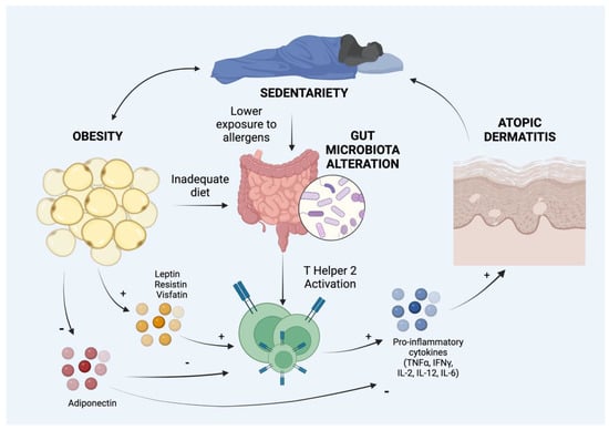 Overweight and obesity affect the gut microbiome, which is involved in the regulation of a wide range of physiological processes (Figure 1). Furthermore, gut microbiota influences many cell-mediated immune pathways and development and the maintenance of the gut mucosa [26]. Recently it has been shown that gut microbiota plays an important role also in the development of AD both in pediatric and adult patients [27]. Therefore, we suggest that even alterations of gut microbiota could play a role in the relationship between obesity and AD [28]. In fact, the gut exposure to microbial agents in early life induces the development of a Th1-type immune population, disadvantaging the Th2 cells, which are known to predispose allergies. Furthermore, the microbiota of AD patients differs from that of non-atopic subjects, since the former are less colonized by Enterococcous and Bifidobacteria and show a higher rate of S. aureus and Clostridia in children [29]. Therefore, obese children have a more sedentary lifestyle and are consequently less exposed to allergens; furthermore, their intake of immune-modulatory nutrients (e.g., vitamin D) is reduced due to a poor and improper diet. These two factors may play a role in allergic sensitization and in the relationship between obesity and AD [30].