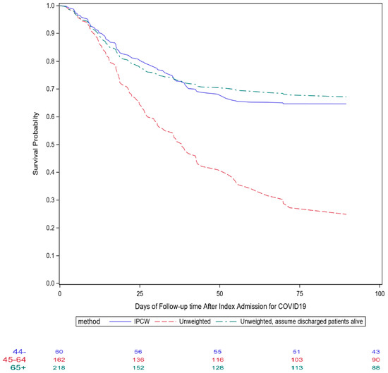 Figure 2 depicts the survival curves estimated using three different approaches: the unweighted approach for recurrent admission events, the same unweighted approach assuming all discharged patients were still alive on 14 July (best-scenario approach for sensitivity analysis), and the IPCW approach.
