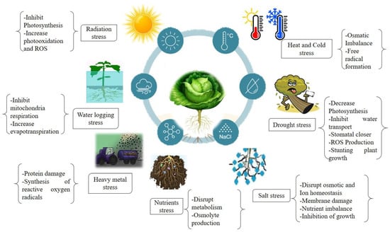 Cold stress is associated with chilly weather (0–15 °C) and frosty weather (<0 °C) that leads to the disturbance of the photosynthetic process and reduces the primary production of B. oleracea [28]. Cold stress impairs metabolic and enzymatic activities that can disrupt the cell membrane and cause seed rotting in Brassica plants [29,30]. Light radiation (low or high) affects plant morphology and the root–shoot ratio [31]. Exposure of broccoli (B. oleracea) to ultraviolet (UV) light can increase ascorbic acid [32,33]. High light causes photoinhibition of the photosystem and protein degradation in B. rapa plants [34]. In short, abiotic stresses alter several internal functions of plants by disturbing homeostasis, physio-biochemical and molecular attributes, such as water and nutrient use efficiency and assimilation, osmotic adjustment, disruption of membrane integrity and enzymatic activities, as well as reduction in photosynthetic efficiency [29,31,34]. The abiotic stresses and their consequences are summarized in Figure 1.