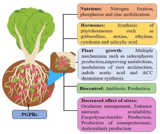 In recent years, the contribution of rhizosphere microorganisms to increasing plant growth and crop productivity as well as tolerance to biotic and abiotic stresses without causing pathogenicity have been discussed in the literature [35]. Several genera of plant growth-promoting rhizobacteria (PGPR) including Azospirillum, Bacillus, Rhizobium, Pseudomonas and Bradyrhizobium showed positive interactions with different vegetables species [36,37]. Several previous studies highlighted the capacity of different PGPRs in biological nitrogen fixation (N2) [38,39], increasing the availability of iron (Fe) [40], phosphorus (P) and zinc (Zn) solubilization and transportation [41,42]. The PGPRs also improved the performance and growth of plants through the production of phytohormones such as gibberellins, ethylene, cytokinin, auxins and salicylic acid [43,44].