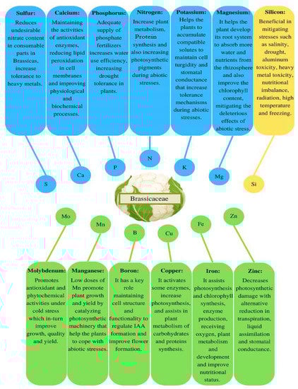 Fertilizers are considered the most important and crucial inputs to achieve greater crop growth and production in modern agriculture [81]. Plants require NPK and other essential micronutrients such as iron (Fe), copper (Cu), zinc (Zn), manganese (Mn), molybdenum (Mo), nickel (Ni), chlorine (Cl) and boron (B) in very small quantities for better performance and yield. These elements are collectively considered as essential for humans and animals and their deficiency can affect their metabolic, physical and mental development. Macro- and micronutrients play a critical role in the effectiveness of several biological compounds and enzymes for the proper functioning of different metabolic processes. The relevance of macronutrients’ essentiality for higher yield and nutritional status has been increasing over several decades [82]. Ensuring that plants are well-fed with essential nutrients is a cost-effective strategy with the capacity to mitigate abiotic stresses and enhance productivity [79,81]. The effect of macro- and micronutrients on different functions of Brassicaceae crops promotes plant growth and increases tolerance to abiotic stresses (Figure 3).