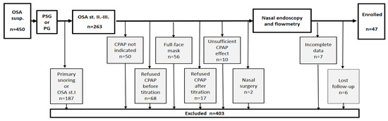 Our research was aimed at revealing the relationship between CPAP adherence and nasal obstruction, as assessed and evaluated by nasal endoscopy (ES6) and nose cavity flow measurement [28]. We employed a strict exclusion process: only 47 out of 450 patients met the demands of the inclusion criteria. For details, see the flowchart in Figure 1.
