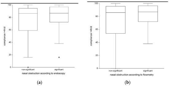 Relationship between CPAP compliance and nasal obstruction according to the endoscopy (a) and flowmetry (b) results..