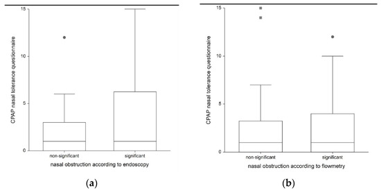 Relationship between the CPAP nasal tolerance questionnaire and nasal obstruction according to the endoscopy (a) and flowmetry (b) results..