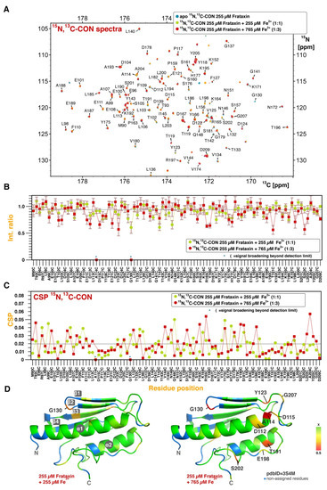 Human frataxin is an important mediator of intracellular iron metabolism, with its deficiency leading to a severe rare disorder [9,10,13]. The assigned metallochaperone role for FXN requires that it binds several iron ions and many studies in human and yeast FXN have pinpointed a canonical binding site for Fe2+ [2,14,17,23,37]. Such binding epitope is mediated by aspartate and glutamate residues and it involves about one third of the protein’s surface. However, this binding site is insufficient to allocate all the expected ions that the protein must bind according to fluorescence titrations [15]. The use of the CON experiment, less sensitive to the Fe2+-induced paramagnetic broadening, suggests that the metal interaction with the protein’s surface extends beyond the canonical site, which is also consistent with the widespread distribution of charged acidic residues (i.e., Asp and Glu) along the surface.
