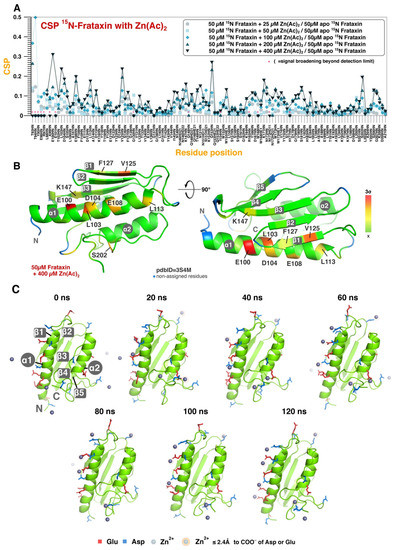 We then obtained a structural model for Zn2+ association to FXN based on an MD simulation in water. During the simulation, Zn2+ ions bind to different regions of the protein at different time points, and they remain coordinated to the hydration layer of FXN for the rest of the simulation (120 ns). Remarkably, at the end of the simulation up to seven different Zn2+ ions can be observed directly interacting with residues E96, D104, E111, D115, D139, D209, and A210 (Figure 2C). Most of the residues (glutamate and aspartate) possess polar charged sidechains that are prone to interact with divalent ions. The C-terminus carboxylic group of A210 residue also could interact with divalent ions, as expected. Consistently, these residues also result in measurable CSPs in the titrations performed with Zn2+ or Fe2+. Interestingly, the MD simulation is able to clinch exchange events of Zn2+ ions between different binding sites, providing a rationale for the intensity losses observed in the NMR titrations.