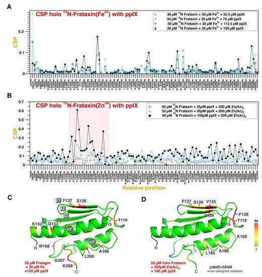 Since FXN binds to FCH and enhances its enzyme activity [2,4,23,24], the possibility of PPIX binding directly to FXN is conceivable, either as a functional association during catalysis or as a regulatory mechanism to manage the pool of available substrate and iron resources. Here, we have explored PPIX binding to apo-FXN or to holo-FXN (i.e., FXN loaded with one equivalent of Fe2+ or with four equivalents of Zn2+) at 298 K, using NMR spectroscopy (1H-15N SOFAST-HMQC).