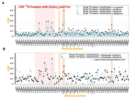 FXN binding to FCH in the presence/absence of PPIX. (A,B) FXN amino acid CSP as a function of FCH concentration in the absence (A) or in the presence (B) of 1 equivalent of PPIX. The Zn2+ concentrations are indicated in the figure legends. Color bands indicate the binding epitopes for PPIX (pink) and FCH (pink + orange).