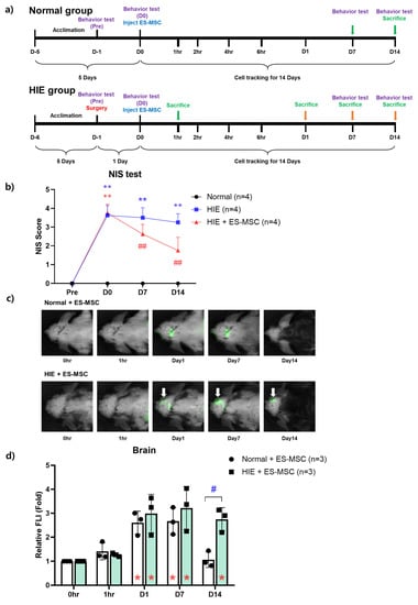 3.1. Improvement in Neurological Behavior in the ES-MSC–Administered HIE Group and Infiltration of the Cells in the Damaged Brain