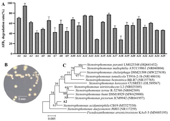 Isolation and identification of AFB1-degrading bacterial strains from BSFL gut. (A) The AFB1 degradation rate by culture medium of different strains. Values are means with their standard errors represented by vertical bars (n = 3). (B) The colony morphology of the strain A2. (C) The phylogenetic tree of the strain A2.