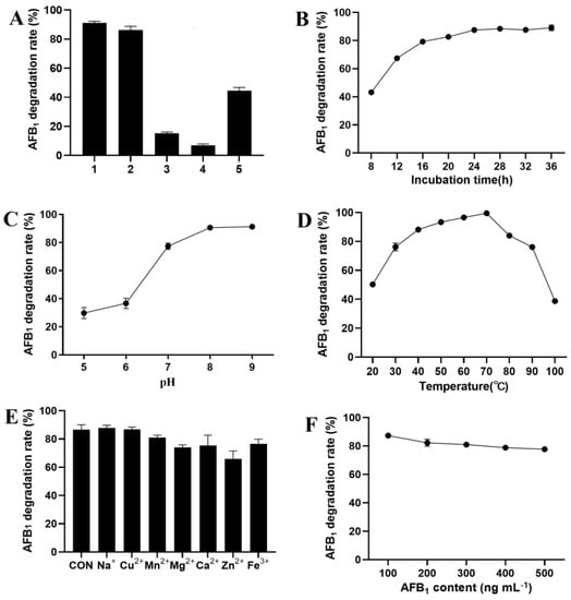 Characterization of the AFB1-degrading capacity of S. acidaminiphila A2. (A) The degradation of AFB1 by different components of the strain A2. 1, Bacterial culture; 2, Culture supernatant; 3, Cell pellets; 4, Cell fragments; 5, Culture supernatant + Proteinase K. The effects of incubation time (B), pH (C), temperature (D), metal ions (E) and substrate concentration (F) on AFB1 degradation by cell-free culture supernatant of S. acidaminiphila A2. Values are means with their standard errors represented by vertical bars (n = 3).