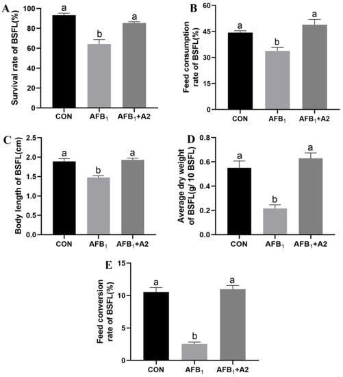 Effects of S. acidaminiphila A2 on the growth performance of BSFL in AFB1 contaminated peanut meal. (A) Survival rate, (B) Feed consumption rate, (C) Body length, (D) Average dry weight, and (E) Feed conversion rate. Values are means with their standard errors represented by vertical bars (n = 3). Values with different letters differ significantly (p < 0.05).
