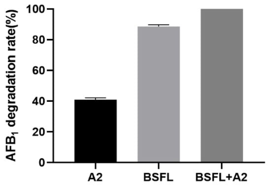 Degradation of AFB1 in peanut meal by BSFL in combination with S. acidaminiphila A2. Values are means with their standard errors represented by vertical bars (n = 3).