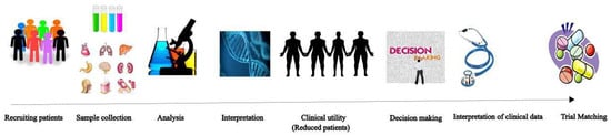 Informatics systems could simplify the recruitment process for clinical trials in PM by integrating genomic data and eligibility for clinical trials. This would allow for more accurate and efficient recruitment, as well as reducing the overall time and cost associated with clinical trials [,,]. It is difficult to develop and study biomarkers due to the complexity of tumor heterogeneity. Another potential issue that can affect the precision of biomarkers is sampling bias []. Furthermore, due to the diversity of brain tumors, tissue banks are difficult to use for PM with respect to proper representation of the removed diseased area []. Thus, due to clonal development in brain tumors, it is important to look at many portions of the tumor []. The challenge of PM is predicting which tumors will respond to standard therapy and which will not. This may require the use of an angiogenesis inhibitor for tumors that do not respond to standard therapy [,]. Targeted drugs cannot change how a tumor forms, but they might be able to improve a person’s quality of life, according to some studies. However, there is disagreement among researchers as to whether targeted drugs are effective in cancer treatment, posing another obstacle to developing these drugs [,].